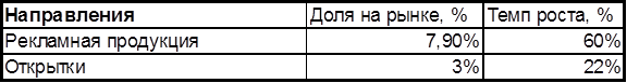 Включена стоимость фурнитуры и печати 4+0 на бумаге 100 гр/м 2.2 Идентификация ключевых компетенций для успеха в полиграфической отраслиПроанализируем сегментацию рынка полиграфических услуг. По данным Министерства печати и массовых коммуникаций на начало 2008 года, в России потребляется различной печатной продукции на сумму более $4,7 млрд. Объем только российского печатного книжного рынка на начало 2008 года эксперты оценивают в $2 млрд. Общий тираж российских газет в 2007 году, предположительно, составит менее 7,8 млрд. экземпляров против 8,05 млрд. в 2005 году. Сегмент упаковки характеризуется стабильным ростом. В последнее время объемы производства упаковочных материалов, изделий и оборудования в России растут ежегодно на 10-12%; в 2006 году оборот этого рынка превысил $7,8 млрд. В сфере производства упаковки заняты 2 тыс. малых и около 1,5 тыс. крупных и средних предприятий. По данным Минпечати, полиграфией в России занимаются от 4,7 до 5,9 тыс. предприятий. В том числе более 1,2 тыс. государственных учреждений, из них 64 – федерального значения, 500 – 600 ведомственных типографий и 3,2 – 4,2 тыс. частных компаний. Число последних ежегодно увеличивается на 100 – 300 единиц – и это не предел, рынок реагирует на повышающийся спрос Полиграфия в России – один из наиболее привлекательных секторов для потенциальных инвесторов как отечественных, так и западных. Традиционная приверженность российских заказчиков офсету меняется в сторону флексографии. Хотя оба рынка продолжают развиваться параллельно. Отдельный и наиболее динамично развивающийся сектор полиграфического рынка – печать рекламной продукции (различных буклетов, этикеток, плакатов, афиш). Оценить его обороты сегодня можно лишь приблизительно, потому что значительная часть этого рынка относится к теневому бизнесу. Основными влияющими рынками для сектора полиграфических услуг являются рынки расходных материалов: 1. рынок бумажных полиграфических материалов; 2. рынок полиграфических красок; 3. рынок полиграфического оборудования. Нынешнее состояние отечественных рынков бумаги в значительной степени тормозит развитие спектра предложений полиграфических услуг в России. Согласно данным Александры Ермаковой, руководителя отдела маркетинга и рекламы ГК «Дубль», в себестоимости тиража бумага составляет 65–70%. При этом наблюдается ежегодное повышение на 5%. И это с учетом того, что в России не производятся мелованные бумаги, которые наиболее востребованы в рекламной полиграфии. Также процесс развития тормозит общая политика государства по таможенным сборам: высокие пошлины (15%) установлены на оборудование и бумагу. Это отражается на себестоимости тиража, и отечественные производители бумаги не могут предоставлять конкурентную цену финским, турецким и украинским производителям. Емкость сегмента упаковки и этикетки на рынке полиграфических услуг в последние годы демонстрирует активный рост. Во многом это объясняется возросшим интересом к картонной упаковке. Потребителями такой продукции являются ведущие отрасли промышленности: фармацевтическая, химическая, легкая. Сектор картона и картонной упаковки еще далек от насыщения, поэтому в ближайшие пять лет рост рынка полиграфических услуг будет обеспечиваться за счет спроса на этикеточно-упаковочную продукцию. Рынок красок не оказывает таког