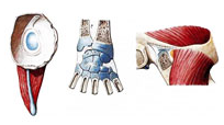 Рис. 285. Плечевой сустав, articulatio humeri (1), суставы кисти, articulationes manus (2), и височно-нижнечелюстной сустав, articulatio temporomandibularis (3), новорожденного. Процесс перестройки первичной суставной пластинки происходит под влиянием мышечных закладок, которые вызывают натяжения в тканях, окружающих будущий сустав. Это натяжение способствует формированию связок сустава еще до образования его полости. В отдельных суставах мезенхима суставного диска рассасывается не полностью, а превращается в волокнистый хрящ, из которого формируются мениски, имеющие свободный край (коленный сустав), и диски, разделяющие полость сустава на две изолированные полости – двухкамерные суставы: височно-нижнечелюстной , грудино-ключичный. Межпозвоночные диски новорожденных имеют относительно большие размеры, чем у взрослого человека. В пожилом возрасте снижается эластичность межпозвоночных дисков, в них появляются очаги окостенения, так же как в передней продольной связке.