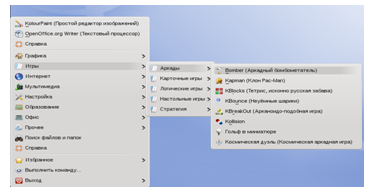 РисВ меню окна в оконном менеджере, который используется в KDE, можно также настроить данное окно таким образом, чтобы оно находилось поверх всех окон (или ниже всех), перенести его на другой рабочий стол или сделать так, чтобы оно отображалось на всех рабочих столах. Для переключения между окнами в рамках одного рабочего стола можно использовать сочетание Alt+Tab, для вывода списка окон, сгруппированных по рабочим столам - кнопку F5. ПО в ALT Linix Master Рассмотрим поподробнее главное меню ОС Раздел Графика включает в себя программы для создания и редактирования изображений. GIMP - редактор изображений в растровом формате, на сегодняшний день самый мощный графический редактор в Linux. KolourPaint - это свободно распространяемое графическое приложение для KDE. Эта программа идеально подходит для решения таких повседневных задач, как: · Рисование - составление диаграмм и рисование «от руки» · Обработка изображений - редактирование снимков экрана и фотографий; применение эффектов · Редактирование пиктограмм - рисование иллюстраций и логотипов с использованием прозрачности Kuickshow - эта программа предназначена именно для группового просмотра изображений. Ksnapshot – программа для создания снимков экрана. TuxPaint – детский графический редактор с недетскими возможностями. Назначение TuxPaint помочь легко и в игровой форме осваивать компьютер ученикам начальной школы. Blender - это, в основном, программа для создания 3D-дизайна. KPovModeler – так же программа для создания 3D-дизайна, но в отличие от программы Blender, KPovModeler более прост в освоении и использовании, более структурирован и близок к математике и физике. Следующий элемент главного меню Игры . Включает в себя:
