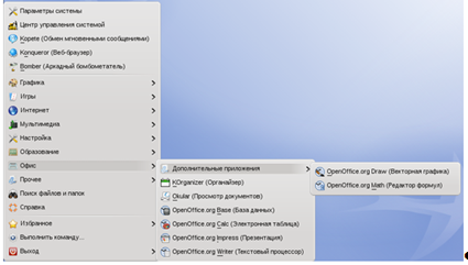 Далее пункт Офис включает в себя программу KOrganize. KOrganizer — простой в использовании менеджер персональной информации (PIM). Вы можете планировать встречи, записывать события и вести список задач. KOrganizer напомнит об ожидающих задачах и поможет организовать ваш график. Следующим пунктом в главном меню является Прочее - здесь практически все программы повторяются и сгруппировано по еще нескольким меню, но открывается доступ к более широкому количеству программ и настроек, вероятнее этот пункт меню создан специально для учителей. Рассмотрим этот пункт более подробно. Меню Прочее-> Графика KSnapshot — это небольшая программа для захвата снимков с экрана. Она пригодна для захвата отдельного окна или всего рабочего стола. Изображения могут быть сохранены в различных форматах. KDE Screen Ruler — приложение для измерения объектов на экране. Gwenview - программа просмотра изображений для KDE. Akregator — это программа для чтения RSS и других новостных лент в режиме онлайн. KGet позволяет вам группировать загрузки. В большинстве случаев KGet может продолжить, если компьютер был выключен, пока загрузка не завершена. KMail - это мощная и удобная в работе почтовая программа. KNetAttach - это приложение, облегчающее интеграцию ваших сетевых ресурсов с вашим рабочим столом KDE Konqueror в KDE - это менеджер файлов, обозреватель Интернета, а также универсальное приложение для просмотра данных. Kopete -- клиент для служб мгновенных сообщений, поддерживающий множество протоколов. KPPP - это программа дозвона и графический интерфейс для демона ppp, позволяющая интерактивно генерировать скрипты и настраивать сеть. Remote Desktop Connection - клиентское приложение, которое позволяет вам просматривать и управлять сеансом на другом компьютере, где выполняется совместимый сервер (VNC). Desktop Sharing является сервером, который позволяет вам предоставлять доступ к своей текущей сессии пользователю на другом компьютере, который использует клиент VNC для просмотра или управления вашим рабочим столом.