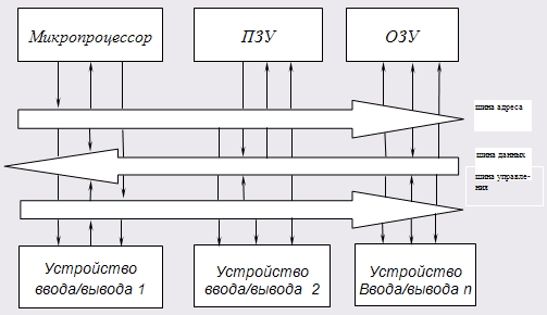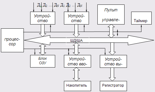 Рисунок 3 По шине данных (ШД) происходит обмен данных между микропроцессором и блоками вычислителя. Данные пересылаются после установки адреса на шине адреса и сигналов управления на шине управления. Количество устройств ввода-вывода в вычислителе может быть различным. Их присутствие в микроЭВМ обязательно, так как при их отсутствии отпадает необходимость в самом вычислителе. Для обмена информацией между микроЭВМ и устройствами ввода-вывода также необходимо адресовываться к ним и посылать управляющие коды по шинам. Ввод сигнала, его представление в дискретную форму, проводится с учетом требуемого интервала дискретизации, определяемого теоремой Котельникова, согласно формуле (1). Величина Dt определяет временной интервал только для одного сигнала.