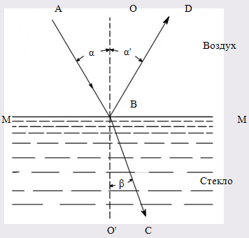 Рис. 1. Поведение луча на поверхности разделаЛиния ММ на рис. 1 изображает поверхность (границу) раздела между воздухом и стеклом. Падающий луч монохроматического света (света, условно одной длины волны) составляет с нормалью О\О’ к поверхности раздела сред угол АВО = α. Этот угол называется углом падения луча. В другой среде луч составляет с нормалью угол преломления О’ ВС = β. Если изменять угол падения луча α, то будет изменяться и угол преломления луча β, но при этом всегда будет сохраняться неизменным отношение синуса угла падения луча к синусу угла преломления: