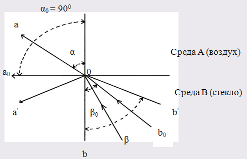 Рис.2. Схема направления распространения лучей при полном внутреннем отраженииb0 Oa0 – распространение луча при предельном угле; b′Oa′ - распространение лучей при полном внутреннем отражении Если луч света распространяется из более плотной среды В в менее плотную среду А (рис.2), то при некотором угле β = β0 угол преломления α достигнет максимального значения α0 = 900 . Далее луч будет распростра-няться вдоль поверхности раздела сред и выражение (2) примет следующий вид: