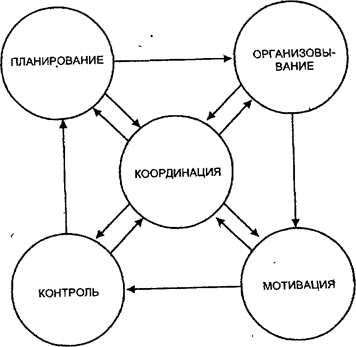 Цели и задачи управления и менеджеров являются отправным моментом для определения объема и видов управленческих работ, которые обеспечивают их достижение. Речь идет о функциях, которые являются составными частями любого процесса управления вне зависимости от особенностей (размера, назначения, формы собственности и т.д.) той или иной организации. (Рисунок 2). Стрелки на диаграмме показывают, что движение от стадии планирования к контролю возможно лишь путем выполнения работ, связанных с организовыванием процесса и мотивированием работающих. В центре диаграммы находится функция координации, обеспечивающая согласование и взаимодействие всех остальных.[4]