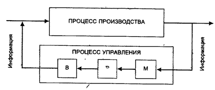 Рис. 2 Взаимосвязь функций управления Выполнение функций управления всегда требует определенных затрат времени и сил, в результате которых управляемый объект приводится в заданное или желаемое состояние. Это и составляет основное содержание понятия «процесс управления». Под ними понимается определенная совокупность управленческих действий, которые логично связываются друг с другом, чтобы обеспечить достижение поставленных целей путем преобразования ресурсов на «входе» в продукцию или услуги на «выходе» системы. В этом определении подчеркивается целенаправленный характер процесса, осуществляемого аппаратом управления организации, а также его связь с функциями, целями и необходимыми для их реализации ресурсами. Процесс управления представляется как совокупность циклических действий, связанных с выявлением проблем, поиском и организацией выполнения принятых решений. Схематически этот подход отражен на рисунке 3, где производственный процесс представлен в виде «черного ящика» с «входами» и «выходами», а управленческий процесс рассматривается в составе трех блоков: М – моделирование состояния объекта управления на основании поступающей от него информации; Р – разработка и принятие управленческих решений; В – организация выполнения принятых решений. Последний блок по информационным каналам связан со «входом» производственного процесса и таким образом обеспечивает изменения, запланированные системой управления.