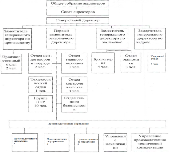 Рис. 5 Организационная структура ПУ в составе ООО «Квинта» Функцией производственных управлений, входящих в компанию «Квинта», является реконструкция и капитальный ремонт оборудования; управление механизацией обеспечивает потребность производственных управлений в телекоммуникационной технике и оборудовании; управление технической комплектации обеспечивает производственные подразделения материально-техническими ресурсами. Высшим органом управления ООО «Квинта» является общее собрание акционеров. К его исключительной компетенции относятся следующие вопросы: внесение изменений и дополнений в устав общества, реорганизация общества, ликвидация общества, утверждение годовых отчетов, бухгалтерских балансов и убытков общества, распределение его прибылей и убытков, иные вопросы, предусмотренные законом. Совет директоров осуществляет общее руководство деятельностью общества, вырабатывает стратегические задачи. Члены Совета директоров в количестве семи человек избираются годовым общим собранием акционеров сроком на один год. Руководство текущей деятельностью осуществляется Генеральным директором. Генеральный директор: руководит всеми видами деятельности предприятия, организует работу и эффективное взаимодействие структурных подразделений предприятия, направляет их деятельность на достижение высоких темпов развития и совершенствования производства, всемерное повышение производительности труда, эффективности производства и качества продукции. Обеспечивает выполнение обязательств перед бюджетами всех уровней, поставщиками, заказчиками и кредиторами. Организует производственно-хозяйственную деятельность. Принимает меры по обеспечению предприятия квалифицированными кадрами, созданию безопасных и благоприятных условий для их труда, обеспечивает разработку, принятие и соблюдение коллективного договора. Решает все вопросы в рамках предоставленных ему полномочий и поручает выполнение отдельных функций другим должностным лицам; заместителям генерального директора, руководителям производственных и функциональных подразделений. Подчиняется совету директоров и общему собранию акционеров. Первый заместитель генерального директора является: вырабатывает техническую политику предприятия, перспективы развития и пути реализации комплексных программ по всем направлениям действующего производства. Обеспечивает повышение уровня технической подготовки производства, его эффективности и сокращения материальных, финансовых и трудовых затрат на производство продукции, работ (услуг), высокий уровень их качества. Соответствие продукции стандартам, техническим условиям и требованиям. Осуществляет контроль за проектной, конструкторской и технологической дисциплиной. Обеспечивает своевременную подготовку проектной документации. Принимает меры по совершенствованию организации производства, труда и управления на научной основе. Руководит деятельностью технических служб предприятия, контролирует результаты их работы. Является главным инженером предприятия. Подчиняется генеральному директору Заместитель генерального директора по производству: обеспечивает поточную организацию работ, ритмичность и повышение эффективности производства, ввод в действие мощностей и объектов производства в у