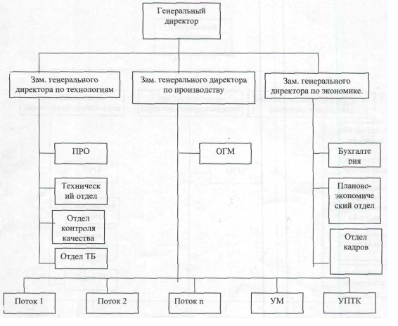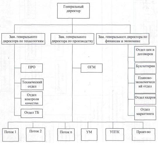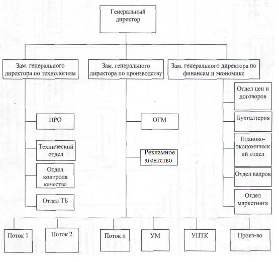 Рис. 7 Организационная структура ООО «Квинта» после первого этапа реструктуризации То есть производственные управления, входящие в компанию будут расформированы и на места их начальников в структуре встанут проектные управляющие (начальники потоков). Начальники потоков будут руководить возведением конкретных объектов и будут полностью ответственны за качество и сроки возведения объектов. Данная структура обеспечит переход ответственности за качество и сроки возведения объектов от групповой к индивидуальной ответственности, что как показывает зарубежный опыт положительно влияет на организацию работ. Так же данная структура создаст значительную экономию на накладных расходах за счет отказа от многоуровневой структуры (центральное управление компании, функциональные управления производственных управлений) одним из недостатков которой является значительная степень дублирования полномочий в организации. Соответственно с появлением более плоской организационной структуры будет решена проблема заниженности диапазона контроля в организации. Линейная структура в рамках организации будет замыкаться на начальника производства в ранге первого заместителя генерального директора телекоммуникационной организации. Начальнику производства и начальникам потоков будут делегированы широкие полномочия вплоть до заключения в уведомительном порядке от лица телекоммуникационной организации единовременных договоров на поставку специального оборудования, комплектующих и материалов, выполнение специальных установочных работ. Так же начальники потоков и будут вести все текущие отношения с управлениями механизации и технической комплектации, а начальник производства координировать и согласовывать деятельность этих подразделений. Управление механизации предлагается перевести в подчинение отделу главного механика. А из управления технической комплектации исключить собственное производство и оставить только укрупнительную сборку. Доход начальников потоков и начальника производства должен быть поставлен в прямую зависимость от экономической эффективности их работы: выполнение и перевыполнение плана по себестоимости производственных работ, срокам возведения объектов. Первый этап реструктуризации Организационная структура компании обладает рядом недостатков, которые можно устранить, модернизировав организационную структуру. На первом этапе реструктуризации происходит переход к проектно-ориентированной работе линейного персонала, т.е. отказ от дивизиональной структуры компании и замена начальников производственных управлений на начальников объектов (потоков), полностью ответственных за качество и сроки возведения объектов, что высвобождает большое количество служащих, работавших в функциональных подразделениях производственных управлений. Но прежде чем приступить к переходу к проектно-ориентированной работе необходимо модернизировать организационную структуру, путем выделения трех блоков: технического, производственного и экономического. Существенное развитие получает экономический блок, благодаря чему руководство предприятия будет иметь более достоверную информацию о текущем состоянии дел в компании, перспективах её развития и ситуации, складывающейся на рынке. Это позволит эффек