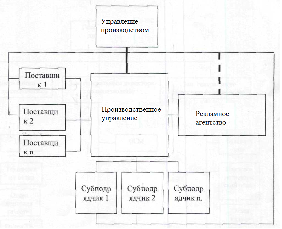 Рис. 6 Организационная структура ПУ в составе формируемой сети В настоящее время выделяют три типа сетевых моделей организации: стабильная сеть, внутренняя сеть, динамичная сеть. В стабильной сети се компоненты жестко связаны с ядром сети конкретными соглашениями. Логика внутренней сети заключается в установлении рыночных отношений между отдельными подразделениями фирмы. Для динамичной сети характерна определенная свобода действий участников сети, как внутри сети, так и за ее пределами. В данном случае предлагается комбинация стабильной и динамичной сети состоящая из пяти базовых блоков: управляющий офис, телекоммуникационная организация, поставщики, субподрядчики. Жесткая связь существует между управляющим офисом и телекоммуникационной организацией. Она осуществляется за счет владения управляющим офисом контрольного пакета телекоммуникационной организации, при этом управляющий офис является генеральным заказчиком телекоммуникационной организации. В случае установки оборудования жесткая связь также может существовать между управляющим офисом и рекламным агентством. Управляющий офис в этом случае является основным учредителем рекламного агентства, а рекламное агентство является окном в рынок для сети. Остальные связи, как телекоммуникационной компании, так и управляющего офиса носят динамичный характер. Управляющий офис в данной системе выполняет роль главного координатора сети, в нем сосредоточены: информация о членах сети, долгосрочные договорные отношения в сети, юридическая поддержка членов сети, выработка стратегии, составление консолидированной отчетности, поиск внешних инвестиций, для промышленного производства поиск заказчиков для установки оборудования. Телекоммуникационная организация выступает в роли технологического центра сети. В ней сосредоточены телекоммуникационные мощности и проектно технологические службы (хотя возможно выделение проектного блока в отдельную бизнес единицу), а так же службы оперативного и планирования и контроля. Телекоммуникационная организация имеет право в уведомительном порядке заключать единовременные договора на установку и поставку материалов и комплектующих. Организация работы линейного персонала происходит с использованием некоторых принципов проектного управления. То есть за производство всего комплекса работ на каждом объекте, за качество и сроки его возведения несет ответственность один человек - проектный управляющий. Так же скалярная цепь линейного управления обособляется в организации путем введения в состав ее руководства должности начальника производства, которому подчинены проектные управляющие. Проектным управляющим и начальнику производства делегируются широкие полномочия вплоть до заключения от лица телекоммуникационной организации единовременных контрактов на поставку оборудования, проведение ремонтных работ. Их полномочия тем шире, чем выше сложность и уникальность возводимых объектов. Для стимулирования роста производительности труда в телекоммуникационной организации рекомендуется введение ее высшего руководства в состав управляющего офиса и постановка части их доходов в зависимость от результатов работы сети. В основном это может касаться должностей генерального директора и начальника производства. В