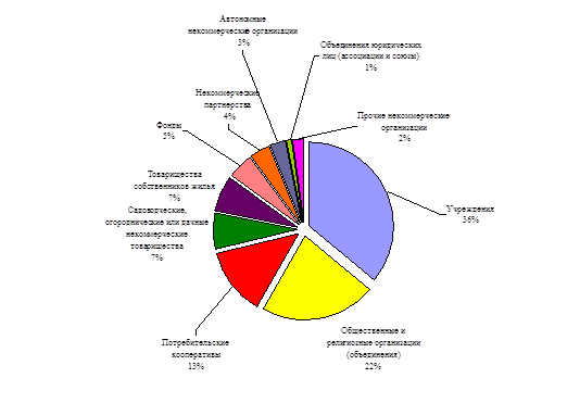 Рис. 1. Распределение некоммерческих организаций По данным Росстата общая численность некоммерческих организаций (кроме бюджетных НКО) в Российской Федерации за период с 1 января 2008 года по 1 января 2009 года увеличилась с 655,4 тыс. до 669,9 тыс., или на 2 %. Рост общей численности был достигнут за счет активного увеличения числа НКО некоторых организационно-правовых форм, в то время как число НКО, имеющих другие организационно-правовые формы, продолжало сокращаться. Наблюдалось значительное увеличение числа товариществ собственников жилья (почти на 20 тыс., прирост за год составил 77% в рамках этой организационно-правовой формы), садоводческих и дачных товариществ (более чем на 2 тыс., прирост за год составил почти 5%), некоммерческих партнерств (более чем 1,5 тыс., прирост за год составил 6,5%), потребительских кооперативов (почти на 2 тыс., прирост за год составил 2,2%). Наибольшее абсолютное сокращение числа наблюдалось среди общественных и религиозных организаций (их число сократилось почти на 8,5 тыс., т.е. на 5,5%), фондов (их число сократилось на 1 тыс., т.е. 3,5%). Динамика изменения численности некоммерческих организаций в разрезе их основных организационно-правовых форм за период 2004-2009 гг. (выборочно) представлена на Рис. 2 и Рис. 3.