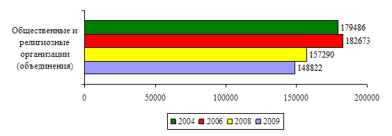 Рис. 3. Число некоммерческих организаций Наиболее многочисленные группы таких организаций – это учреждения, созданные органами государственной и муниципальной власти, а также потребительские кооперативы. Не менее актуальным является вопрос о числе реально действующих российских НКО. Не секрет, что ряд организаций существует только на бумаге, не ведет, по тем или иным причинам, деятельность, предусмотренную их уставами. Такие организации искажают представления о потенциале российского некоммерческого сектора, его ресурсах и способности решать социально значимые задачи. Вместе с тем, информация о динамике численности реально действующих НКО могла бы послужить важным индикатором качества среды, в которой живет российский некоммерческий сектор, а также индикатором состояния гражданского общества: рост числа реально действующих НКО может восприниматься как свидетельство благоприятных условий для деятельности в некоммерческом секторе, как свидетельство роста гражданской активности. При этом, оценка численности реально действующих в нашей стране НКО по международным стандартам позволяет представить, какую позицию занимает Россия в глобальном контексте гражданского общества. Согласно данным всероссийского обследования НКО, в негосударственных некоммерческих организациях по найму на условиях полного или неполного рабочего дня (полной или неполной рабочей недели) трудится 1,13% экономически активного населения России. Среди подростков в 2009 году был велик и потенциал оценки собственной социальной активности. Более двух третей опрошенных подростков считают себя общественно активными людьми (67%). Данные сильно разнятся с опросом взрослого населения. Среди россиян старше 18 лет только чуть больше четверти относят себя к общественно активным людям. Почти каждый пятый тинэйджер ожидаемо сообщает, что не имеет опыта общественной работы (19%). Россиян более старшего возраста, отмечающих данную позицию, в два раза больше. В 2009 году подростки чаще всего занимались общественной работой по месту учебы, но и достаточно часто – по принуждению старших. Однако заметен и тот факт, что подростки и люди старше 55 лет чаще других занимаются общественной работой по месту жительства. Так, участие в каких-либо мероприятиях, организованных самими гражданами по месту жительства (субботниках, ремонте, собраниях жильцов, дежурстве) привлекает значительную часть подростков (37%). Это является достаточно высоким показателем, учитывая, что подростки больше ориентированы на учебу и общение. В 2009 году в школьных организациях состояло 16% подростков, в объединениях неполитического характера – 15%. Участники молодежных политических организаций составляют 5%, что является существенным показателем для молодого поколения. Подводя итог, необходимо отметить, что прирост структурных элементов гражданского общества совсем невелик, однако при рациональной стратегии развития гражданского общества этот показатель может быть значительно увеличен. гражданский общество социальный россия2.4 Направления развития гражданского общества в России: cтратегия и необходимые действияРазвивающееся российское общество многолико и разнообразно. Несмотря на далекие от тепличных условия, в которых на протяжении десятилетий оформлялись и заявляли о себе социальные