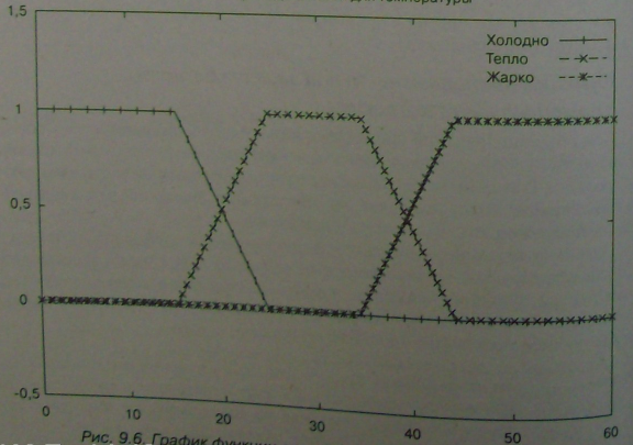 Рис. 2. График функции принадлежности для температуры При создании функции принадлежности использованы следующие программные конструкции, которые позволяют задать границы функции принадлежности с помощью группы значений, представляющих ее параметры. Функции, которые используются для создания функций принадлежности. public float spikeProfile (float value, float lo, float high) { float peak; value += (-lo); if ((lo < 0) && (high < 0)) { high = -(high - lo); } else if ((lo < 0) && (high > 0)) { high += -lo; } else if ((lo > 0) && (high > 0)) { high -= lo; } peak = (float)(high / 2.0); lo =(float)0.0; if (value < peak) { return (value / peak); } else if (value > peak) { return ((high - value) / peak); } return (float)1.0; Функция, spikeProf ile, задает обычную функцию принадлежности в виде треугольника. Задаются значения 1о и high, которые определяют базовые вершины треугольника. Высшая точка задается как high/2. public float plateauProfile(float value, float lo, float lo_plat, float hi_plat, float hi) { float upslope; float downslope; value += (-lo); if (lo < 0.0) { lo_plat += -lo; hi_plat += -lo; hi += -lo; lo = 0; } else { lo_plat -= lo; hi_plat -= lo; hi -= lo; lo = 0; } upslope =(float) (1.0 / (lo_plat - lo)); downslope = (float)(1.0 / (hi - hi_plat)); if (value < lo) return (float)0.0; else if (value > hi) return (float)0.0; else if ((value >= lo_plat) && (value <= hi_plat)) return (float)1.0; else if (value < lo_plat) return ((value - lo) * upslope); else if (value > hi_plat) return ((hi - value) * downslope); return (float)0.0; } Функция, plateauProf ile, задает функцию принадлежности в форме трапеции (пример - функция принадлежности для температуры на рис. 2)Затем с помощью функции plateauProfile дополнительно создаются те функции принадлежности, которые распространяются до границ (например, функции холодно и жарко на рис. 2). Их задача заключается в том, чтобы определить степень принадлежности заданного значения и аргументов функции. График функции принадлежности для напряжения определяет в области напряжения три функции принадлежности: низкое, среднее и высокое. Аналогично задаются три функции принадлежности для области температуры: холодно, тепло и горячо. Эти значения используются только для демонстрации и не учитывают какую-либо технологию производства батарей. Функции принадлежности для напряжения //функция принадлежности для низкого нааряжения public float m_voltage_low(float voltage) { const float lo = (float)5.0; const float lo_plat = (float)5.0; const float hi_plat = (float)5.0; const float hi = (float)10.0; if (voltage < lo) return (float)1.0; if (voltage > hi) return (float)0.0; return plateauProfile(voltage, lo, lo_plat, hi_plat, hi); } //функция принадлежности для среднего напряжения public float m_voltage_medium(float voltage) { const float lo = (float)5.0; const float lo_plat = (float)10.0; const float hi_plat = (float)20.0; const float hi = (float)25.0; if (voltage < lo) return (float)0.0; if (voltage > hi) return (float)0.0; return plateauProfile(voltage, lo, lo_plat, hi_plat, hi); } //функцияпринадлежностидлявысокогонааряжения public float m_voltage_high(float voltage) { const float lo = (float)25.0; const float lo_plat = (float)30.0; const float hi_plat = (float)30.0; const float hi = (float)30.0; if (voltage < lo) return (float)0.0; if (voltage > hi) return (float)1.0; return plateauProfile(voltage, lo, lo_plat, hi_plat, hi); } Все функции принадлежности используют функцию plateau Profile, чтобы построить график. Каждая из них принимает значение напряжения и затем возвращает значение, которое соответствует ее степени принадлежности. Каждая функция сначала проверяет переданное значение на соответствие диапазону функции принадлежности. Если значение не выходит за рамки диапазона, оно передается в функцию plateauPro f ile . При этом ее сигнатура задается как вектор [lo, lo__plat, hi_plat, hi], а затем пользователю возвращается результат. Функции принадлежности для температуры // функция принадлежностми для высокой температуры public float m_temp_hot(float temp) { const float lo = (float)35.0; const float lo_plat = (float)45.0; const float hi_plat = (float)45.0; const float hi = (float)45.0; if (temp < lo) return (float)0.0; if (temp > hi) return (float)1.0; return plateauProfile(temp, lo, lo_plat, hi_plat, hi); } // функция принадлеж