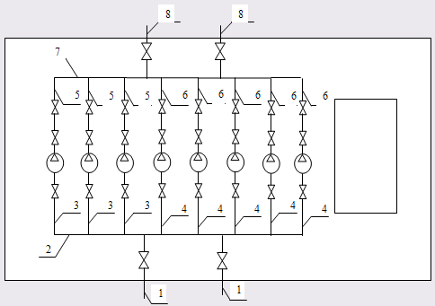 В разделе 1 определили количество рабочих агрегатов – 3 насоса типа К90/55 и 3 насоса типа К20/30. Проектируемая насосная станция относится к 1 категории надежности, тогда количество резервных насосов принимаем – 2 насоса типа К90/55. Следовательно, общее количество насосов составит 3 насоса типа К20/30 и 5 насосов типа К90/55. Выбираем расположение насосов в 1 ряд параллельно. По всем найденным данным можно составить конструктивную схему машинного зала насосной станции. Схема 1