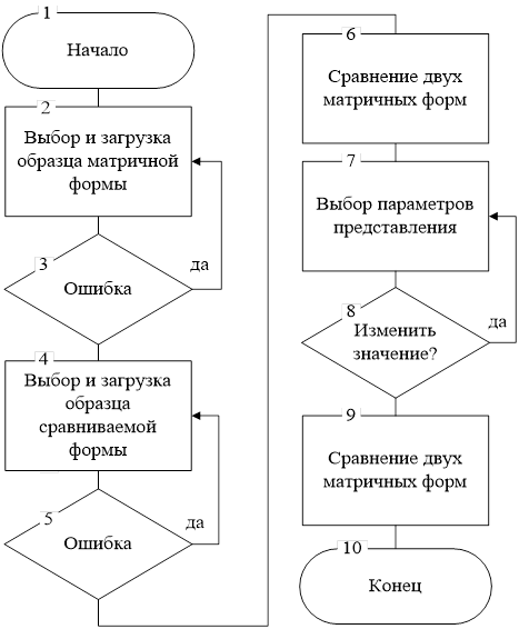 Альтернативным вариантом реализации ПСПИ может быть самостоятельная разработка с использованием одного из языков программирования высокого уровня, интегрированных средств разработки (ИСР) в сочетании с использованием универсальных средств (текстовых редакторов, графических редакторов, редакторов электронных таблиц, редакторов презентаций, средств создания справочных систем). 1.3 Анализ возможных вариантов реализации ПС представления информации В настоящее время ПСПИ реализуются с использованием двух основных подходов: а) локальная архитектура; б) клиент-серверная архитектура. В данном проекте использована локальная архитектура, которая предполагает размещение всех компонентов (программных модулей) на одном компьютере. Такой подход применяется в случае невозможности организовать локальную вычислительную сеть (ЛВС) и распределение автоматизированных рабочих мест (АРМ), а так же в случае если программа не требует использования дополнительных АРМ. В данном случае этот вариант применим для решения задачи оценки информации в процессе боевой подготовки, так же в ходе и подготовки к несению боевого дежурства. В соответствии с классификацией, определенной в ГОСТ 19.101-77 «Виды программ и программных документов»: а) программный комплекс – это программа, состоящая из двух или более компонентов и (или) комплексов, выполняющих взаимосвязанные функции и применяемая самостоятельно или в составе другого комплекса; б) программный компонент – это программа, рассматриваемая как единое целое, выполняющая законченную функцию и применяемая самостоятельно или в составе комплекса. ПСПИ, разрабатываемая в настоящем проекте, состоит из одного компонента и, следовательно, является программным компонентом, применяемым самостоятельно либо в составе различных сред. 1.4 Определение требований к ПС представления информации 1.4.1 Функциональные требования Исходя из целей, стоящих перед ПСПИ и задач, решаемых пользователями при работе с ними, основными процессами, подлежащими автоматизации, являются: а) процесс обработки входной информации; б) процесс взаимодействия пользователей с графической информацией. Указанные процессы относятся к основным. Для их автоматизации в составе ПСПИ должен быть реализован следующий набор функций: а) входной контроль данных; б) настройка параметров представления. Функция контроля входных данных предполагает: а) проверка на соответствие входной информации с поставленными ограничениями; б) остановка выполнения программы с вызовом сообщения об ошибке. Проверка на соответствие входной информации с поставленными ограничениями предполагает сравнение поступающей информации с эталонными значениями входных данных. В случае несоответствия входной информации поставленным ограничениям программа останавливает свое выполнение с вызовом сообщения об ошибке и ожидает загрузки корректных данных. Функция перевода табличных данных в графический вид. Данная функция осуществляет построение трехмерного изображения по данным входной симметричной матричной формы. Функция сравнения графических изображений Данная функция осуществляет сравнение формы образца с измененной матричной формой. Функции, автоматизирующие процесс взаимодействия пользователей с графической информацией. Взаимодействие пользователей 