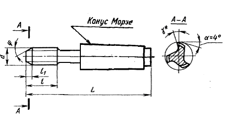 Переход 05. Метчик машинный с коническим хвостовиком из быстрорежущей стали Р6М5 ГОСТ 17927-72 с использование специальной переходной втулки 5/1 ГОСТ 13598