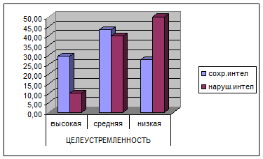 Рис. 6 Распределение значений активности у детей с сохранным и нарушенным интеллектом Что касается распределения значений целеустремленности, то он сохраняется только у детей контрольной группы. Среди детей с нарушением интеллекта преобладающее большинство с низким уровнем целеустремленности. Чуть меньше со средним уровнем, а так же их меньше, если сравнивать с контрольной группой. Совсем мало детей с нарушением интеллекта с высоким уровнем целеустремленности, сохранных детей с этим уровнем значительно больше (рис. 7).