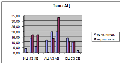 Рис. 9 Частота встречаемости АЦ – типов у испытуемых групп Характеризуя типы ЦП (целеустремленность, пластичность) детей с нарушением интеллекта, можно отметить, что детей целеустремленных и пластичных, целеустремленных и лабильных, а также безразличных ригидных не наблюдается. Преобладающее большинство - это дети безразличные, лабильные. Далее по убывающей идут дети заинтересованные, лабильные; заинтересованные, пластичные. Одинаковое количество детей целеустремленных, ригидных и заинтересованных, ригидных; реже всего встречаются безразличные пластичные. Сравнивая типы детей с сохранным и нарушенным интеллектом, можно отметить, что заинтересованные и ригидные, заинтересованные и лабильные, а также безразличные и ригидные дети с нарушением интеллекта встречается чаще, чем дети с сохранным интеллектом (рис. 10).