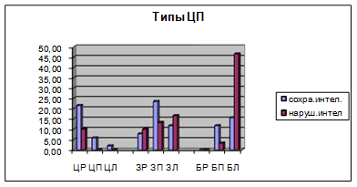 Рис. 10 Частота встречаемости ЦП – типов у испытуемых групп Анализ полученных данных относительно типа АП (активные, пластичные) у детей с нарушением интеллекта свидетельствует о том, что интенсивных и ригидных, адекватных и ригидных, спокойных и пластичных, а так же спокойных лабильных детей не наблюдается. Преобладающее большинство – это адекватные (в меру активные), лабильные дети. Меньше, но достаточно часто встречаются интенсивные, лабильные дети. Еще реже встречаются спокойные, ригидные; затем идут адекватные, пластичные. И очень редко встречаются интенсивные пластичные. Сравнивая типы детей с сохранным и нарушенным интеллектом, можно отметить, что интенсивные и лабильные, адекватные и лабильные, спокойные и ригидные дети с нарушением интеллекта встречается чаще, чем дети с сохранным интеллектом (рис. 11).