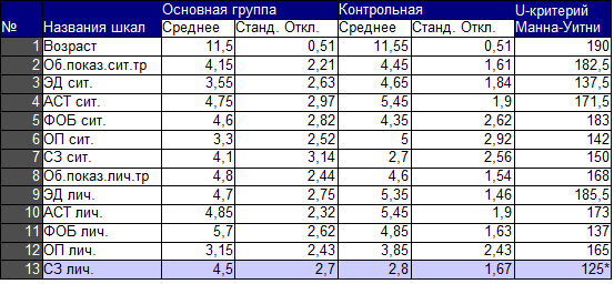 Средние значения и стандартные отклонения, полученные в исследуемых группах по методике ИТТ *различия достоверны, при р≤0,05