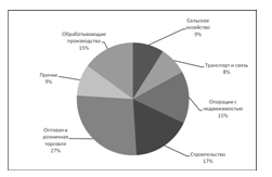 По размеру портфеля кредитов, выданных малому и среднем бизнесу, на 1 января 2010 года второе место занимает «Россельхозбанк» - 277 млрд руб. Портфель бессменного лидера рэнкинга «Сбербанка» на 1 января 2010 года на момент публикации материала не известен, но по итогам I полугодия он составлял порядка 470 млрд руб. Замыкает тройку лидеров «ВТБ 24» - 71 млрд руб (табл. 2).[11] Если рассмотреть отраслевое распределение кредитов, то оно соответствует распределению малых предприятий по отраслям (рис.1).