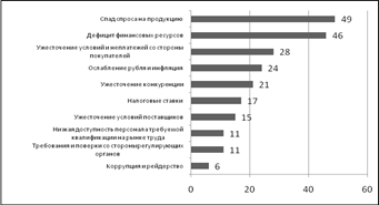 Рис. 8 - Дисконт по транспорту, % Столь существенные «уценки» приводят к тому, что многие предприятия МСБ просто не в состоянии предоставить необходимое количество залога и вынуждены либо обращаться за помощью к частникам, ссужающим деньги под 60-70% годовых, либо оставаться без оборотных средств. В условиях кризиса почти половина предприятий МСБ ощутила спад спроса на продукцию и дефицит финансовых ресурсов (рис. 9). По оценкам самих бизнесменов, эти два взаимосвязанных фактора в течение трех-четырех месяцев «вымыли» оборотные средства у многих компаний, поставив их на грань закрытия: рефинансироваться невозможно - не хватает залога, обслуживать кредиты почти нереально - подняты ставки, а покупатели мало того что сократили закупки, но периодически объявляют дефолт и ничего не платят.[11]