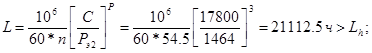 где X=1 – коэффициент радиальной нагрузки; Y=0 - коэффициент осевой нагрузки; V=1 - коэффициент при вращении внутреннего колеса по отношению к направлению нагрузки; kБ=1,3 - коэффициент безопасности (табл. 14.18,); kТ=1 - температурный коэффициент;