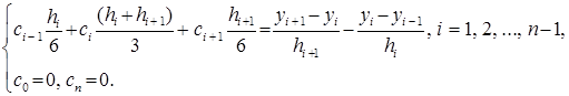 Определить значения коэффициентов ci , i = 0, 1, 2, …, n. 4. Определить значения коэффициентов di и bi , i = 1, 2, 3, …, n, воспользовавшись формулами: di = (ci –ci – 1 ) / hi , i = 1, 2, …