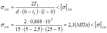 - допускаемое напряжение на смятие: при стальной ступице и спокойной нагрузке ; при чугунной – вдвое меньше. В случае неравномерной или ударной нагрузки на 25-40% ниже.