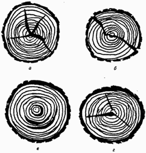 Рис. 1. Пороки древесины: а - морозобоина; б - метиковые; в - отлупные; г - усушки. Пороки формы ствола Сбежистость — значительное (выше нормы) уменьшение диаметра ствола от комля к вершине, в пиломатериалах ведет к перерезанию волокон; сильно понижает пределы прочности при поперечном изгибе. Кривизна ствола — искривление по длине ствола; бывает простая кривизна — характеризуется одним изгибом по длине ствола и сложная — несколькими изгибами. Закомелистость — резкое увеличение диаметра комлевой части (в 1...2 раза и более) по сравнению с диаметром сортамента, измеренном на расстоянии 1 м от комлевого торца (частый случай сбежистости). Ребристая закомелистость носит название ройки. Этот порок также уменьшает выход пиломатериалов и шпона. Пороки строения древесины.