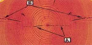 Пороки древесины: А - трещины метиковые; Б - трещины отлупные. Наклон волокон (косослой) — волокна располагаются не параллельно оси ствола, а винтообразно, по спирали. Косослой оказывает отрицательное влияние на качество древесины, ее физико-механические свойства. Наклон волокон >5% значительно снижает предел прочности древесины при растяжении вдоль волокон и поперечном изгибе. С изменением влажности древесина с наклоном волокон склонна к значительному короблению и скручиванию. Крень бывает сплошная и местная. Характерна для комлевой части наклонных и искривленных стволов хвойных пород. Это резкое утолщение поздней зоны годичных слоев при эксцентричном расположении сердцевины. Плотность древесины сильноразвитой крени на 15...40% выше нормальной (кремнина) и мешает механической обработке древесины. Свилеватость — волнистая и путаная — неправильность в строении древесины, резковолнистое или беспорядочное расположение древесных волокон. Встречается преимущественно у лиственных пород в нижней комлевой части ствола у осины, клена, ясеня, березы, тополя и др. Свилеватость снижает у древесины прочность при растяжении, изгибе, сжатии, но увеличивает прочность при скалывании. Свилеватую древесину используют в качестве отделочного строительного материала. Повреждения насекомыми (червоточина). Червоточиной называют повреждения древесины в виде поверхностных бороздок, внутренних ходов (каналов) и отверстий, проделанных некоторыми насекомыми, а чаще всего их личинками. К таковым относятся жуки-короеды, жуки-усачи, долгоносики, домовые жуки-точильщики, некоторые разновидности муравьев, бабочки (древоточцы и стеклянницы), термиты. Степень пораженности древесины этим пороком определяют количеством отверстий на 1 м лесоматериала, а в фанере — количеством отверстий на один лист. Кроме того, следует отметить дефекты, которые возникают в основном при неправильных режимах обработки древесины. Трещины усушки образуются в срубленной древесине и пиломатериалах при несоблюдении установленного режима сушки. Различают трещины торцевые, пластевые, кромочные, сквозные. Трещины усушки имеют меньшую толщину, чем метиковые и морозные, но также снижают прочность и сортность древесины. Покоробленность относится к деформациям, возникающим при распиловке или сушке древесины; она затрудняет или даже полностью исключает использование пиломатериалов. Механические повреждения при обработке древесины — отщеп, скол, вырыв и другие также затрудняют использование ее по назначению.