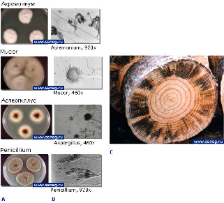 Рисунок 1.1 −Плесневые грибы: A) Вид колонии на чашке; B) Под микроскопом; C) На древесине Деревоокрашивающие грибы вызывают специфическую синевато-серую окраску заболони, называемую «синевой», в соответствии с рисунком 1.2.