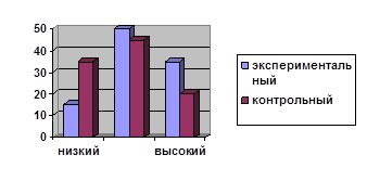 Рис. 6. Распределение испытуемых по уровням сформированности умения анализировать использование способов выражения этикета с позиции уместности и целесообразности На основании выше изложенных данных были сделаны следующие выводы: · По результатам второго среза 2 учащихся экспериментального класса и 11 учащихся контрольного класса имеют низкий уровень сформированности речевого этикета. При первом срезе низкий уровень был замечен у 13 учащихся экспериментального класса и у 10 учащихся контрольного класса. Таким образом, в экспериментальном классе данный уровень повысился на 55%, а в контрольном на 5%. · По результатам второго среза 11 учащихся экспериментального класса и 7 учащихся контрольного класса имеют средний уровень сформированности речевого этикета. При первом срезе средний уровень был замечен у 6 учащихся экспериментального класса и у 5 учащихся контрольного класса. Таким образом в экспериментальном классе данный уровень повысился на 25%, а в контрольном на 10%. · По результатам второго среза 7 учащихся экспериментального класса и 3 учащихся контрольного класса имеют высокий уровень сформированности речевого этикета. При первом срезе высокий уровень был замечен у 2 учащихся экспериментального и контрольного класса. Таким образом в экспериментальном классе данный уровень повысился на 25%, а в контрольном на 5%. Динамика изменений в уровне сформированности речевого этикета представлена на рисунках 6 и 7.