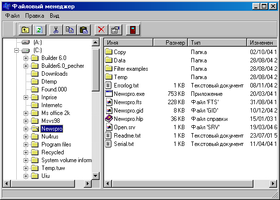 При запуске программы создается главная форма, затем приложение ожидает действия пользователя. Каждому предусмотренному действию сопоставлена какая-то функция-обработчик. При нажатии на кнопки «Удалить» и «Создать» программа выводит на экран соответствующие диалоговые окна, где так же есть предусмотренные действия пользователя с объектами на этих формах. После выполнения какого-либо действия, программа возвращается в режим ожидания пользовательских действий. Для завершения работы с Файловым Менеджером пользователю достаточно нажать на кнопку «Закрыть» системного меню, находящуюся в правом верхнем углу окна программы. Выводы Результатом данной курсовой работы является программа для работы с файлами. Программа представляет собой необходимый минимум для выполнения этой задачи. Программа может иметь более развитый интерфейс и двупанельный вид — в общем случае имеют две равноценных панели для списка файлов, а в данном случае программа имеет однопанельный вид. В данной курсовой работе это не было реализовано. Список используемой литературы 1. Общая информация http://yandex.ru/ http://www.google.ru/ http://ru.wikipedia.org/ 2. Информация о языке программирования http://www.itkursi.ru/ ПауэрсЛ., СнеллМ. Microsoft Visual Studio 2008 => Microsoft Visual Studio 2008 Unleashed by Lars Powers and Mike Snell. 3. Алгоритмы программы http://program.rin.ru/ http://www.progz.ru/ Листинги 1.1. Листинг Unit1.h enum {ImageWindows, ImageFloppy, ImageDrive, ImageCD, ImageMyComp,ImageCloseFolder, ImageOpenFolder}; voidstrcat0(char * &dest,char *source); //Соединение строк с оставлением нулевого символа void finstr(char *dest); unsigned int lengthfinstr(char *dest); struct DROPFILES { DWORD pFiles; // offset of file list POINT pt; // drop point (client coords) BOOL fNC; // is it on NonClient area // and pt is in screen coords BOOL fWide; // WIDE character switch }; class TForm1 : public TForm { __published: // IDE-managed Components TMainMenu *MainMenu1; TMenuItem *NFile; TTreeView *TreeView1; TSplitter *Splitter1; TListView *ListView1; TImageList *ImageList1; TImageList *ImageList2; TMenuItem *NProperty; TImageList *ImageList3; TImageList *ImageList4; TControlBar *ControlBar1; TToolBar *TBMain; void __fastcall TreeView1Expanding(TObject *Sender, TTreeNode *Node, bool &AllowExpansion); void __fastcall TreeView1Compare(TObject *Sender, TTreeNode *Node1, TTreeNode *Node2, int Data, int &Compare); void __fastcall TreeView1Expanded(TObject *Sender, TTreeNode *Node); void __fastcall TreeView1Collapsing(TObject *Sender, TTreeNode *Node, bool &AllowCollapse); void __fastcall TreeView1Editing(TObject *Sender, TTreeNode *Node, bool &AllowEdit); void __fastcall ListView1Compare(TObject *Sender, TListItem *Item1, TListItem *Item2, int Data, int &Compare); void __fastcall ListView1DblClick(TObject *Sender); void __fastcall ListView1MouseDown(TObject *Sender, TMouseButton Button, TShiftState Shift, int X, int Y); void __fastcall TreeView1DragOver(TObject *Sender, TObject *Source, int X, int Y, TDragState State, bool &Accept); void __fastcall TreeView1DragDrop(TObject *Sender, TObject *Source, int X, int Y); void __fastcall TreeView1MouseDown(TObject *Sender, TMouseButton Button, TShiftState Shift, int X, int Y); void __fastcall NPropertyClick(TObject *Sender); void __fastcall NOpenClick(TObject *Sender); void __fastcall NExitClick(TObject *Sender); void __fastcall NDeleteClick(TObject *Sender); void __fastcall TBDeleteClick(TObject *Sender); void __fastcall TBPropertyClick(TObject *Sender); void __fastcall TBExitClick(TObject *Sender); void __fastcall NViewClick(TObject *Sender); void __fastcall NPanelClick(TObject *Sender); void __fastcall NStatusBarClick(TObject *Sender); void __fastcall TBUpClick(TObject *Sender); void __fastcall TreeView1Edited(TObject *Sender, TTreeNode *Node, AnsiString &S); void __fastcall ListView1Edited(TObject *Sender, TListItem *Item, AnsiString &S); void __fastcall NRenameClick(TObject *Sender); void __fastcall TBRenameClick(TObject *Sender); void __fastcall NIconClick(TObject *Sender); void __fastcall NSmallIconClick(TObject *Sender); void __fastcall NListClick(TObject *Sender); void __fastcall NReportClick(TObject *Sender); void __fastcall ListView1DragOver(TObject *Sender, TObject *Source, int X, int Y, TDragState State, bool &Accept); void __fastcall ListView1DragDrop(TObject *Sender, TObject *Source, int X, int Y); void __fastcall TBUpdateClick(TObject *Sender); void __fastcall TreeView1Click(TObject *Sender); void __fastcall TBPasteClick(TObject *Sender); void __fastcall TBCopyClick(TObject *Sender); void __fastcall TBCutClick(TObject *Sender); void __fastcall NUpdateClick(TObject *Sender); void __fastcall NCutClick(TObject *Sender); void __fastcall NPasteClick(TObject *Sender); void __fastcall NCopyClick(TObject *Sender); void __fastcall NSelectAllClick(TObject *Sender); void __fastcall ListView1ColumnClick(TObject *Sender, TListColumn *Column); void __fastcall NSort0Click(T