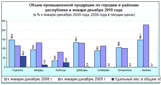 В течение рассматриваемого периода текущего года практически во всех городах и районах республики отмечено восстановительный рост объемов производства продукции. Наибольший удельный вес (59,5%) в общем объеме промышленного производства республики приходится на промышленные предприятия города Тирасполь и города Днестровск, объем производства, которых возрос в текущих ценах на 15,7% по отношению к 2009 году (к 2008 году – на 46,5%) и составил 4 112,0 млн. руб., из которого 45,0% объема промышленного производства приходится на ЗАО «Молдавская ГРЭС». Сравнивая объем промышленного производства предприятий города Тирасполь и города Днестровск в 2010 году, за вычетом объемов ЗАО «Молдавская ГРЭС», которое в 2008 году обеспечивало 18,8% промышленного производства в городе, необходимо отметить, что объем остальных предприятий города не только достиг но и превысил выпуск базисного показателя 2009 года (прирост 30,1%) при этом на 23,5% не достиг уровня производства 2008 года. Реализация в рассматриваемом периоде текущего года мероприятий по повышению конкурентоспособности производства, восстановление прежних и поиск новых рынков сбыта позволили обеспечить рост промышленного производства хозяйствующих субъектов городов и районов республики. Значительный рост объема производства продукции в рассматриваемом периоде текущего года отмечен в Каменском районе и городе Каменка – в 2,3 раза, по отношению к 2008 году увеличение на 46,1%. Наибольший удельный вес (80,0%) в общем объеме промышленного производства района приходится на ЗАО «Каменский консервный завод», объем производства которого составил 40,3 млн. руб. и возрос в текущих ценах в 2,8 раза, что способствовало увеличению объема промышленного производства в целом по району. Тенденция увеличения производства промышленной продукции отмечена в городе Бендеры – на 30,6% (уровень 2008 года не достигнут по данному показателю на 6,5%), чему послужило увеличение производства на таких предприятиях как: – ЗАО «Днестр-авто» – в 4,0 раза, столь значительный рост связан с освоением выпуска новой продукции, на заводе сумели перепрофилироваться на потребности аграрного сектора, в связи с чем, 85,0% продукции отправляется на крупные сельхозпредприятия. – ОАО «Флоаре» – на 69,0%. В 2010 году на ОАО "Флоаре" были разработаны и внедрены в производство новых моделей мужской, женской и детской обуви, отвечающих современным направлениям моды. Ввод нового оборудования позволил активно использовать самые передовые технологии, применять современные материалы, что позволило увеличить производительность предприятия. – Филиал «Завод «Прибор» ФГУП МПП «Салют» – на 52,7%, столь значительное увеличение связано с решением вопроса об экспорте продукции двойного назначения. Увеличение объема производства продукции в январе-декабре 2010 года отмечен в Дубоссарском районе и городе Дубоссары – на 29,8% (к уровню 2008 года – на 32,1%), что связано с увеличением объема промышленного производства на Дубоссарском филиале ГУП «ЕРЭС» – на 43,4%, В Слободзейском районе и городе Слободзея увеличение промышленного производства наблюдается – на 14,2% (к 2008 году отмечено снижение – на 10,9%). Основной удельный вес (45,3%) в общем объеме промышленного производства Слободзейском районе и городе Слободзея занимает легкая промышленность, которая представлена таким предприятием как