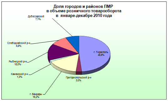 Положительная динамика данного показателя сложилась во всех городах и районах республики. Основная доля розничного товарооборота в рассматриваемом периоде 2010 года была сформирована в городе Тирасполь и городе Днестровск (48,6% от общего объема по республике), в городе Бендеры (16,2%) и в Рыбницком районе и городе Рыбница (15,0%). Однако, наибольшее увеличение данного показателя в сопоставимых ценах по отношению к соответствующему периоду прошлого года отмечено в Слободзейском районе и городе Слободзея и Дубоссарском районе и городе Дубоссары на 13,1% и на 10,8% соответственно, удельный вес в общем объеме розничного товарооборота в республики составил соответственно 8,8% и 7,1%.В январе-декабре 2010 года прирост розничного товарооборота наблюдается в Григориопольском районе и городе Григориополь в сопоставимых ценах составил 2,7%. Рынок платных услуг населению является существенной частью потребительского рынка и подвержен влиянию общих для потребительского сектора экономики тенденций. В общем объеме платных услуг населению (без субъектов малого предпринимательства) наибольшую долю (42,8%) занимают жилищно-коммунальные услуги, которые по итогам 2010 года возросли на 22,1%. Так, в анализируемом периоде текущего года объем платных услуг, оказанных населению организациями всех форм собственности и физическими лицами, по городам и районам республики превысил в сопоставимых ценах уровень соответствующего периода прошлого года на 3,6% и составил 1 598,6 млн. руб. Наибольшая доля (52,9% от общего объема) по платным услугам приходится на город Тирасполь. В течение рассматриваемого периода текущего года незначительное снижение данного показателя отмечено в Каменском районе и городе Каменка на 1,2%, Слободзейском районе и городе Слободзея на 1,0%, а также в Григориопольском районе и городе Григориополь на 0,7%. В остальных городах и районах республики отмечено увеличение объема услуг. Немаловажным показателем эффективности социально-экономического развития городов и районов республики являются финансовые результаты деятельности предприятий. По итогам января-декабря 2010 года организациями городов и районов республики был получен положительный сальдированный результат от финансово-хозяйственной деятельности в сумме 851,6 млн. руб., что выше уровня соответствующего периода прошлого года на 58,4%. Результатом финансово-хозяйственной деятельности практически всех городов и районов республики явилась прибыль, при этом наибольший положительный финансовый результат получен предприятиями города Тирасполь и города Днестровск. Так, в январе-декабре 2010 года результатом финансово-хозяйственной деятельности 131 предприятий города Тирасполь и города Днестровск получен сальдированный финансовый результат – прибыль – в размере 1 112,8 млн. руб., превысив уровень соответствующего периода прошлого года на 39,2%. Однако, отрицательный финансовый результат отмечен в Рыбницком районе и городе Рыбница. В январе-декабре 2010 года результатом финансово-хозяйственной деятельности предприятий Рыбницкого района и города Рыбница получен сальдированный финансовый результат – убыток – в размере 375,9 млн. руб. (за 2009 год был получен отрицательный сальдированный финансовый результат в сумме 247,2 млн. руб.). В рассматриваемом периоде 2010 года из общего количества отчитавшихся органи