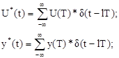 Аппроксимируемая и аппроксимирующая кривая Расчёт на ЭВМ переходной функции модели и сравнение её с заданной показывают, что модель адекватна реальному процессу. Максимальное отклонение друг от друга ординат аппроксимируемой и аппроксимирующей переходных характеристик не превышает 4%. 5. Расчет оптимальных настроечных параметров цифровых регуляторов Модель и расчетная схема цифровой АСР При исследовании систем с цифровыми регуляторами обычно вместо известной структурной схемы цифровой АСР с АЦП, ЦАП и ЦВУ рассматривают модель цифровой АСР и далее ее расчетную схему. Модель цифровой АСР В АЦП осуществляется преобразование непрерывного сигнала U, y в дискретную последовательность чисел U и y, где lt – дискретное время, t – такт квантования, l – номер такта квантования. При исследовании систем с цифровым регулятором перейдём от функциональной схемы к модели цифровой системы. В модели АЦП заменяют дельта импульсными модуляторами, а ЦАП входит как демодулятор. Демодулятор и объект образуют приведённую непрерывную часть системы с передаточной функцией: Wпнч =Wдн *Wm . Дельта импульсные модуляторы осуществляют преобразование сигналов U и y в синхронные импульсные последовательности U* и y* в соответствии со следующими формулами: