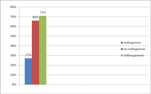 Основной «помехой» в межличностном общении у студентов, со сценарной проекцией «Победитель», «Не-победитель» и «Преобразователь», является неадекватное проявление эмоций . В процентном соотношении полученные результаты можно выразить так: «Победитель» - 27% от 11 испытуемых. «Не-победитель » - 66% от 12 респондентов «Преобразователи» - 71% от 7 респондентов. (рис. 3) У студентов с жизненным сценарием «Не-победитель» и «Преобразователи» проблема «неадекватного проявления эмоций» встречается чаще (66% и 71%), чем у студентов с жизненным сценарием «Победитель» (27%). Рис. 3Связь жизненного сценария с эмоциональной сферой.