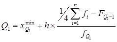 Коэффициент вариации используют не только для сравнительной оценки вариации единиц совокупности, но и как характеристику однородности совокупности. Совокупность считается количественно однородной, если коэффициент вариации не превышает 33%. Так как коэффициент вариации в данном случае составляет 27,18%, т.е. значительно меньше 33%, то исследуемая совокупность является количественно однородной. 4. ХАРАКТЕРИСТИКА СТРУКТУРЫ РАСПРЕДЕЛЕНИЯ Структура распределения характеризуется такими показателями, как медиана, квартили и децили. Медиана ряда распределения была определена в разделе 2, она составила 153,45. Аналогично медиане вычисляются значения признака, делящие совокупность на четыре равные по числу единиц части. Эти величины называются квартилями и обозначаются заглавной латинской буквой Q с подписным значком номера квартиля. Очевидно, что Q2 равно медиане распределения. Значения признака, делящие ряд на пять равных частей, называют квинтилями, на десять частей – децилями, на сто частей – перцентилями. Для расчёта квартилей применяются следующие формулы: 1) для несгруппированных данных: Нижний (первый) квартиль (Lower quartile):