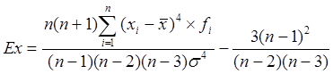 Этот показатель называют коэффициентом асимметрии. Он может быть рассчитан как по сгруппированным, так и по несгруппированным данным. С помощью момента четвертого порядка характеризуется свойство рядов распределения, называемое эксцессом. Показатель эксцесса рассчитывается по формуле: