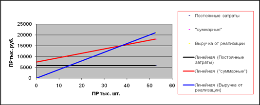 Рисунок 1.3 Порог рентабельности, отражающий увеличение прибыли на 60% за счет изменения постоянных затрат В)Изменение переменных затрат на единицу ВМнов = Пнов + Ипост = 3080 + 5775 = 8855 тыс. руб. Ипер нов = Внов - ВМнов = 52,5*400 – 8855 = 12145 тыс. руб. Ипер вд = Ипер нов / Qнов = 12145 / 52,5 = 231,33 руб. ПРруб = Ипост / к ВМ = 5775/ (8855 / 21000) = 13695,65 тыс. руб. ПРшт = Ипост / ВМед = 5775 / 400–231,33) = 34,238 тыс. шт.