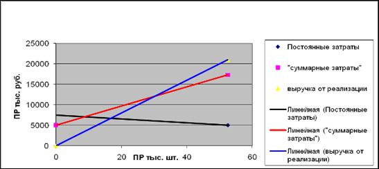 В данной таблице представлены значения анализируемых факторов (критические значения), при достижении которых прибыль предприятия упадет до нуля, т.е. при падении объема реализации до 37,5 т. шт. или цены до 361,5 руб. за ед. прибыль будет равна 0 руб. и предприятие встает на порог рентабельности. В случае роста переменных и постоянных затрат до 14224,88 и 7700 т. руб. соответственно, прибыль также станет равна нулю. Запас финансовой прочности, рассчитанный для анализируемых факторов, показывает какое %-ое изменение может выдержать фактор до полной потери предприятием прибыли. Наибольший ЗФП у постоянных издержек, т.е. их можно увеличивать в пределах 33,3% прежде чем прибыль станет равной 0. Наименьший ЗПФ у цены. Ее можно снизить только на 9,62%. При дальнейшем снижении предприятие начнет нести убытки.
