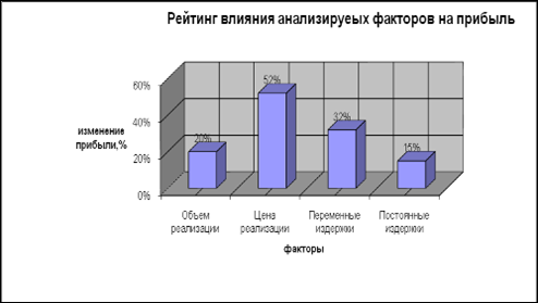 Из расчетов, приведенных в таблице видно, что наибольшее влияние на изменение прибыли оказывает цена. Она имеет наибольшую силу операционного рычага, следовательно, даже незначительное ее изменение приводит к существенному изменению прибыли. Вторым по степени воздействия на прибыль являются переменные затраты (Рпер = 6,39) Его изменение также существенно влияет на изменение прибыли. Наименьшее влияние оказывают объем (ОР=4), постоянные затраты (Рпост = 3), изменение их на 15% приведет к изменению прибыли на 45%.
