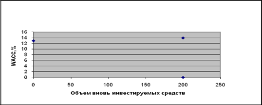Найдём точку перелома: Точка перелома = нераспределённая прибыль / доля собственного капитала =32/0,16 = 200 тыс. руб. нераспределённая прибыль =40*(1–0,2)=32 доля собственного капитала =40/250*100%=0,16 капитал=62,5+62,5+125=250 Рассчитаем средневзвешенную стоимость капитала: WACC = ∑ Ki * di, где Кi – стоимость i-го источника средств, %; di – удельный вес i-го источника средств в общей их сумме. Таблица 3.3 – Расчёт средневзвешенной стоимости капитала