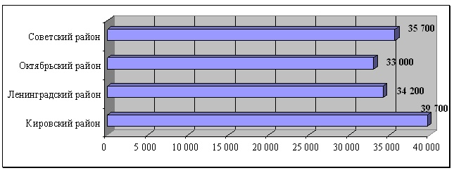 Рис.9 Средние цены предложений 3-комнатных квартир, руб. Самая высокая стоимость одного квадратного метра трехкомнатных квартир наблюдается в Кировском районе - 39 700руб./кв.м., далее по убывающей можно расположить Советский, Ленинградский и Октябрьский районы, средневзвешенная стоимость квадратного метра в этих районах колеблется около 35 000руб./кв.м. Площадь однокомнатных квартир в г.Томске находится в интервале от 55 до 100 кв.м. Большая часть всего объема предложений жилой недвижимости, приходится на трехкомнатные квартиры площадью 70 кв.м.