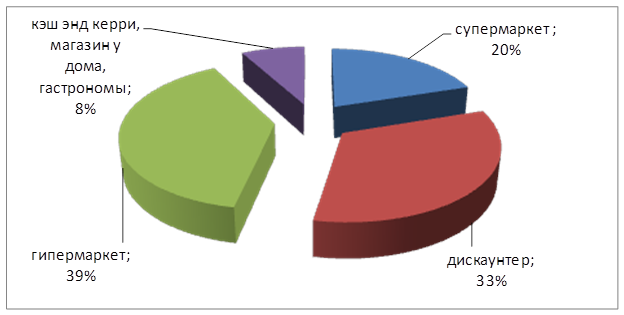 Рисунок 1.1 Структура розничной торговли в России в 2007 году Рынок торговли продуктами в России делится на три части: независимые операторы (несетевые магазины), торговые сети, неорганизованная торговля (рынки). Как видно из рисунка 1.1, большую часть российского продуктового рынка в 2007 году занимали независимые операторы, на них приходилось порядка двух третей рынка (67,2%), сетевые операторы занимали 17,5%, а доля рынков составляла 15,3% (по материалам фрагмента отчета «Маркетинговое исследование и анализ российского рынка розничной торговли». Лидерами в стране по общему количеству магазинов, по данным РБК («РосБизнесКонсалтинг»), являются два игрока: краснодарская компания ООО «Магнит», работающая в формате дискаунтеров (магазины Магнит) и компания X5 Retail Group, развивающая разные форматы торговли (магазины Пятёрочка, Перекрёсток, Мер-кадо-Суперцентр). Столь бурное развитие продуктовых сетей в России аналитики связывают, прежде всего, с ростом экономики страны: высокие цены на неочищенную нефть и природный газ, основные экспортные товары, а также высокий спрос на них в стране. Растущая экономика поддерживается ростом уровня доходов и расходов россиян. Сейчас в России все сетевые продуктовые магазины делят на шесть форматов по типу торговли в них: 1. Супермаркеты 2. Гипермаркеты 3. Кэш энд Керри 4. Дискаунтеры 5. Магазин у дома 6. Гастрономы класса премиум и суперпремиум Супермаркет (от лат. super + mercatus – сверхторговля) – крупный универсальный магазин самообслуживания по продаже полного ассортимента продуктов питания и напитков, а также бумажных изделий для домашнего хозяйства, мыла, порошков для стирки и мойки посуды, предметов санитарии и гигиены, книг в бумажных обложках, комнатных цветов и растений, продуктов для домашних животных (собачьего и кошачьего корма), автомобильных товаров, игрушек, поздравительных открыток, косметики, посуды, лекарств (продающихся без рецепта), бытовой техники и т.п. В некоторых супермаркетах есть свои хлебопекарни, предлагаются различные услуги (брокерские, страховые и др.). Супермаркеты часто являются отделениями крупных торговых сетей. По уровню организации сети супермаркетов делятся на; - международные (супермаркеты сети располагаются в разных странах); - федеральные (супермаркеты сети располагаются в разных субъектах РФ); - региональные (супермаркеты сети располагаются в разных городах 1 субъекта РФ); - локальные (супермаркеты сети располагаются в одном городе). Гипермаркет – это предприятие розничной торговли, реализующее продовольственные и непродовольственные товары универсального ассортимента преимущественно по форме самообслуживания, торговой площадью от 5000 м². Согласно ГОСТ Р 51773–2001 «Розничная торговля. Классификация предприятий» гипермаркет – это предприятие розничной торговли, реализующее продовольственные и непродовольственные товары универсального ассортимента преимущественно по форме самообслуживания, торговой площадью от 5000 м². От других магазинов самообслуживания и от супермаркетов гипермаркеты отличаются, прежде всего, масштабностью. Это не только большие торговые площади (от 5 тыс. м²), но ещё и универсальный ассортимент товаров, превышаюший ассортимент супермаркета в 3–10 раз, особенно это касается непродовольственных товаров, насчитывающий обычно до 40–50 тысяч позиций. А