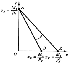 Рис. 2. Множество возможностей потребителя K и L - доступные наборы, в и Е - недоступные Поскольку конечной целью нашего анализа является изучение реакции потребителя на изменение цен и дохода, нам необходимо, очевидно, рассмотреть, как изменяются при изменении цен и доходов границы доступного множества. Начнем с изменения дохода. Пусть первоначально доход потребителя составлял М1 . Тогда бюджетная линия описывается уравнением (линия АВ на рис. 3) y = M1 /PY – (PX /PY )x. (5)