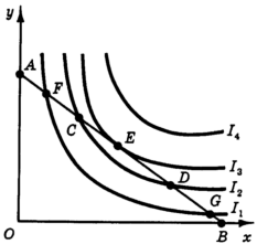 Рис. 5. Оптимум потребителя Прежде всего мы должны, очевидно, сформировать критерий потребительского выбора. Критерий этот, впрочем, нам уже известен из предыдущего обсуждения: потребитель, по нашему предположению, стремится максимизировать получаемую им полезность, т.е. выбирает наиболее предпочтительный для себя набор товаров из множества доступных ему наборов. На графике (рис. 5) множество доступных нашему потребителю товарных наборов отображается треугольником ОАВ. Представим себе вначале, что точка потребительского выбора в доступном множестве лежит ниже бюджетной линии АВ. Это означает, что некоторая часть потребительского дохода осталась неизрасходованной. В рамках нашей модели, однако, доход может тратиться лишь на приобретение двух товаров, причем возможность сбережений не предусматривается. В этих условиях дополнительные закупки товаров на неизрасходованные денежные средства, очевидно, будут увеличивать извлекаемую потребителем полезность, что следует из предположения ординалистской теории полезности — “больше — лучше, чем меньше”. Иными словами, точка потребительского выбора обязательно должна лежать на бюджетной линии АВ. Какая же из точек на бюджетной линии соответствует оптимальному, с точки зрения потребителя, набору товаров? Рассмотрим точку F. Точка F лежит на пересечении бюджетной линии АВ и кривой безразличия I1 . Кривая безразличия I1 пересекает бюджетную линию также в точке G. Очевидно, что точки F и G не являются наиболее предпочтительными для потребителя, поскольку при движении вниз по бюджетной линии от точки F и вверх по бюджетной линии от точки G потребитель переходит на более высоко расположенные кривые безразличия и, следовательно, на более высокий уровень полезности. Рассмотрим теперь точку С, более предпочтительную, чем точка F. Точка С лежит на кривой безразличия I2 пересекающей бюджетную линию в точке D. Точки С и в не являются точками оптимального потребительского выбора по тем же причинам, что и точки F и G. Вообще говоря, из свойств кривых безразличия и из рис. 5 очевидно, что если некоторая кривая безразличия пересекает бюджетную линию в двух точках, то все точки бюджетной линии между ними будут более предпочтительны для потребителя. И лишь в том только случае, если кривая безразличия имеет одну и только одну общую точку с бюджетной линией (точка Е на рис. 5), эта точка соответствует наиболее предпочтительному для потребителя набору товаров из всего множества доступных этому потребителю наборов. Точка Е называется точкой потребительского оптимума, поскольку расположена на наиболее высоко лежащей из доступных потребителю кривых безразличия, т.е. соответствует наиболее высокому уровню удовлетворения при данных доходе потребителя и ценах товаров. Как известно, наклоны двух линий в точке их касания равны. Следовательно, в точке Е наклон бюджетной линии равен наклону кривой безразличия. Вспомним теперь, что наклон кривой безразличия в данной точке равен предельной норме замены MRS, а наклон бюджетной линии - соотношению цен товаров PX /PY . Следовательно, в точке потребительского оптимума Е MRS = PX /PY (8) Это свойство оптимального набора может быть легко объяснено логически. В самом деле, предельная норма замены MRS отражает то соотношение, в котором потребитель желает обменивать товар Y на това