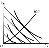 Рис. 1. Кривая доход-потребление Х - питание, а y – одежда На основании линии доход-потребление можно построить график доход-расходы для отдельного блага. На горизонтальной оси будем откладывать величину дохода, а на вертикальной - денежную сумму расходов на данное благо (рис. 2). Кривые такого типа называют кривыми Энгеля - по имени немецкого статистика XIX в. По характеру кривых Энгеля можно судить об отношении потребителя к благам: c ростом дохода кривая расходов на питание теряет наклон - спрос насыщается, а кривая расходов на одежду становится все круче - почти все приращение дохода уходит на одежду. Эта зависимость была видна на линии доход-потребление (рис. 1).