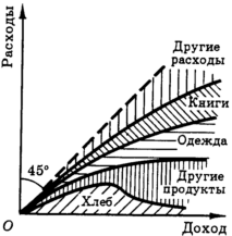 Рис. 20. Кривые Энгеля для Америки, 1875г Здесь, как и на предыдущем графике, расходы на питание занимают еще довольно большую часть общих расходов, но уже видны небольшие сбережения при росте дохода, а также "дефицитное" потребление при очень маленьком его уровне.