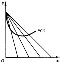 Рис. 6. Кривые безразличия не касаются осей координат В этом случае при движении вдоль кривой безразличия норма замещения изменяется от нуля до бесконечности, и каково бы ни было соотношение цен PX /PY , точка равновесия будет отвечать условию (8). 2. Кривые безразличия имеют общие точки с одной или обеими осями координат (рис. 7), т. е. потребитель может полностью отказаться от некоторого товара, компенсируя этот отказ увеличенным потреблением другого. При этом может оказаться, что на всей кривой безразличия MRS > PX /PY или MRS < PX /PY .