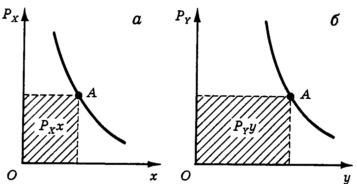 Рис. 14. Кривая спроса для товара Х (а) и для товара Y (б) Площадь заштрихованного прямоугольника обозначает сумму расходов на товар Итак, потребитель находится в точке А (рис. 15, а), покупая в единицу времени x0 товара Х по цене и y0 товара Y по цене (рис. 15, б). Когда цена Х внезапно падает с до , у потребителя появляется лишняя сумма денег, которой он может распорядиться. Этот выигрыш потребителя не зависит от формы кривой спроса, он полностью определяется исходным объемом потребления x0 и величиной падения цены (-). Но кривая спроса показывает, как он распределит высвободившуюся сумму. Посмотрите на рис. 15, а. Потребитель увеличивает расходы на товар X, переходя по кривой спроса из точки А в точку В. Заштрихованные площади на рис. 15, а показывают уменьшение расходов из-за снижения цены и их увеличение, связанное с покупкой дополнительного количества товара X.